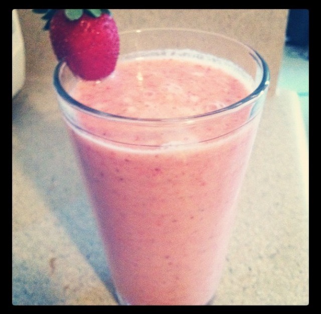 To save time in the morning, you can prepare the strawberries and bananas the night before and freeze them overnight. In the morning, combine all your ingredients together in a blender. If you’re using ice in your smoothie, put them in the blender first and then the rest of the ingredients on top. Blend until all ingredients are smooth and combined. Pour your smoothie into your cup and drink it on your way to a happy stomach. Enjoy!